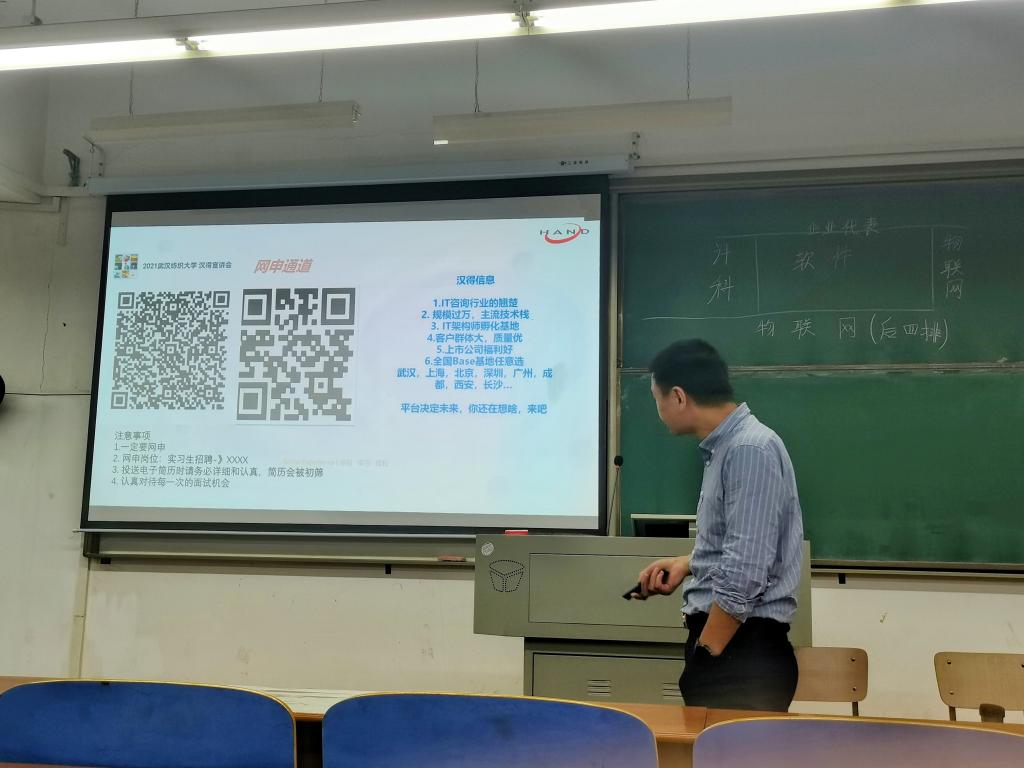 达梦、百家云、上海汉得等5家IT企业负责人通过视频宣传、PPT展示以及面对面交流的方式,讲解当前主流市场IT技术发展的技术,以及学习方向、后期就业学生需要关注公司类型、职业规划、公司规模和行业, 并就公司概况、工作环境、培训机制、企业文化等学生关心的问题做了详细的介绍,与此同时,同学们积极咨询相关岗位薪资以及职业前景,解决了自身在实习、求职方面的诸多疑虑。