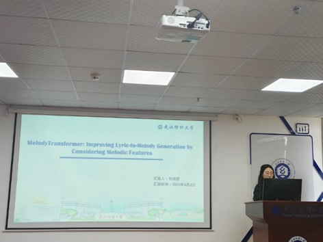 刘瑞雪同学分享的主题是“MelodyTransformer:Improving Lyric-to-Melody Generation by Considering MelodicFeature”。她针对歌词-旋律配对数据不足及现有方法忽视音乐特性的问题,提出创新解决方案:采用非端到端生成策略缓解数据限制,并设计专用MelodyTransformer模型,通过考虑音符时值、音高等特征实现针对性旋律生成。实验表明,该方法在客观指标和主观评价上均优于现有模型,验证了音乐专用模型架构的重要性,为歌词配曲任务提供了新的技术思路。