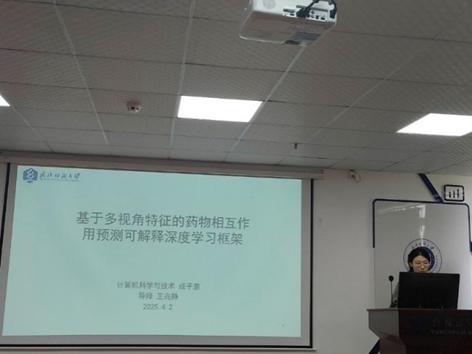 成子惠同学分享的主题是“A Multi-View Feature-Based interpretable Deep Learning Framework for Drug-Drug Interaction Prediction”。当患者同时服用多种药物时,药物间相互作用(DDIs)会导致有害后果。因此,准确预测 DDI 至关重要。然而,目前的方法仅集中于单一视图特征,如原子视图特征或子结构视图特征,从而限制了对 DDI 预测的准确性。基于多视角特征的可解释性研究比较稀少。多视角特征对于追踪相互作用至关重要。针对这一空白,她提出了MI-DDI,一种基于多视角特征的可解释性深度学习框架。为了充分提取多视角特征,她采用了消息传递神经网络从RDkit生成的分子图中学习原子特征,同时从药物 SMILES 中学习子结构视图嵌入。这些原子视图和子结构视图特征合并成一个整体药物嵌入矩阵。随后,精心设计的交互模块不仅为理解相互作用建立了一条可行的途径,还直接为权重矩阵的构建提供了信息,这样就能进行精确、可解释的相互作用预测。在BIOSNAP数据集和DrugBank数据集上的验证表明了MI-DDI 的优越性。
