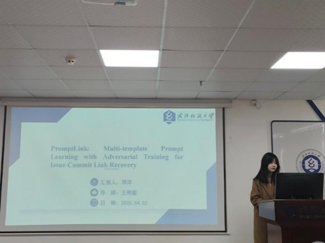 邓洋同学分享的主题是“PromptLink: Multi-template prompt learning with adversarial training for issue-commit link recovery”。现有的软件跟踪方法降低了任务的复杂性,但忽略了预训练语言模型上游任务与下游链接恢复任务之间的不一致性,使得未能充分利用预训练模型的语义信息。为了缓解这个问题,她首次引入新的范式,提出了一种基于多模板提示学习与对抗训练的Issue-Commit链接恢复方法(PromptLink)。具体而言,通过构建不同的提示模板,对预训练模型的知识注入,从而增强模型对软件制品的理解能力。此外,PromptLink结合对抗训练,在数据层面引入扰动。实验使用了六个开源项目,实验结果表明PromptLink在issue-commit需求跟踪任务上性能超越了SOTA方法,在六个项目上的F1值平均提升了8.61%。