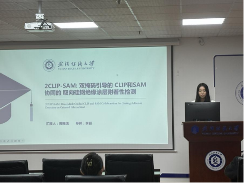 周雅烯同学分享的主题为“2CLIP-SAM: Dual-Mask Guided CLIP and SAM Collaboration for Coating Adhesion Detection on Oriented Silicon Steel”。取向硅钢表面绝缘涂层的质量直接影响其磁性能稳定性与使用寿命。为提升检测效率并降低成本,采用机器视觉替代人工检测势在必行,但传统方法受限于少样本和高光干扰。为此,她们提出一种基于CLIP与SAM协同的少样本跨域异常检测框架2CLIP-SAM。该框架引入多源跨域学习与域对抗训练,构建双CLIP定位网络,实现对涂层脱落区域与反射高光区域的粗定位,显著提升模型在少样本条件下的泛化能力。进一步,设计双掩码高光抑制(MDS)机制以削弱光干扰,并借助SAM模型实现脱落区域的精细化分割。依据GB/T 2522-2007标准开展的1000组测试表明,该方法检测效果优于人工测量,为涂层附着性的自动化评估提供了可靠解决方案。