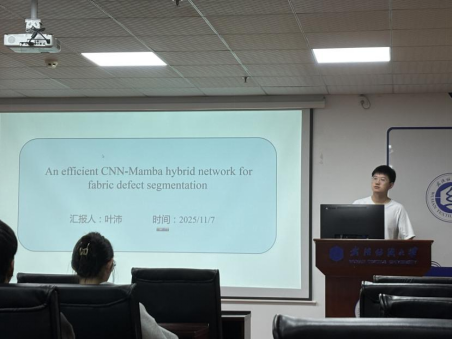 叶沛同学分享的主题为“An efficient CNN-Mamba hybrid network for fabric defect segmentation”。织物缺陷检测对纺织行业的质量控制与经济效益至关重要。传统方法和基于 CNN 的方法难以应对复杂的缺陷纹理。尽管 Transformer 在捕获图像全局上下文方面表现优异,但其高计算开销阻碍了在工业场景中的部署。近期火热的 Mamba 模型凭借线性复杂度建模全局上下文的能力,在计算机视觉领域展现出巨大潜力。为此,他们提出一种新颖的 CNN-Mamba 混合模型,并引入小波特征分解(WFD)模块。WFD 利用 Haar 小波变换对特征进行解耦,使 Mamba 专注于低频信息,同时让 CNN 强化高频细节。他们的方法在参数更少的前提下实现了更优的性能。