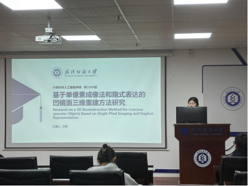 王娟同学分享的主题为“3D Reconstruction of Concave Specular Objects via Single-Pixel Imaging and Implicit Representations”。凹镜面物体因镜面高光与多重反射,其三维重建一直是计算机视觉和光学领域难题,传统方法处理效果有限。她们提出基于单像素成像与隐式表达的分阶段重建方法,借助傅里叶频谱单像素成像技术捕获反射光线、获取点对关系,并以此为物理先验重建几何结构。仿真实验和真实数据验证显示,该方法突破传统技术局限,在复杂形状及反射干扰场景中适应性与鲁棒性优异。