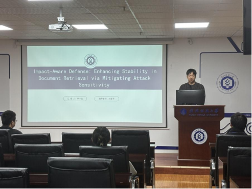 李小龙同学分享的主题为“Impact-Aware Defense: Enhancing Stability in Document Retrieval via Mitigating Attack Sensitivity”。近年来,得益于多种语言模型的迅速发展,文档检索领域取得了显著进展。然而,当对抗性攻击通过对文档内容进行细微扰动以操纵排序结果时,仍面临关键挑战。现有的防御模型通常依赖于对抗攻击的先验知识或基于集成的鲁棒性认证,从而限制了其实际应用。为弥补这一缺口,他提出了一种影响感知防御算法(Impact-Aware Defense,IAD),该算法无需依赖先验攻击知识或集成推理,即可有效缓解排序操纵问题。IAD 的核心在于一种影响感知损失函数,它显式地最小化模型对特定词语的依赖,并通过掩码策略实现对扰动的不变性。更重要的是,理论分析证明了该方法的排序稳定性,有效约束了排名分数的波动。在三个广泛使用的检索基准数据集上的实验结果表明,IAD 在对抗攻击下显著提升了模型的鲁棒性。该方法实现了新的最新性能(state-of-the-art),在平均倒数排名(Mean Reciprocal Rank, MRR)上相较于此前最优结果取得了高达 29.4% 的相对提升。