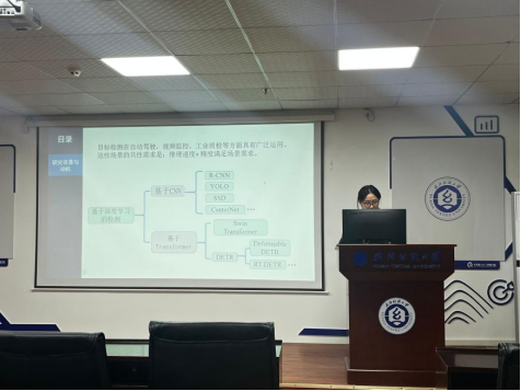 李珠婷同学分享的主题为“DETRs Beat YOLOs on Real-time Object Detection”。她们针对YOLO系列受非极大值抑制(NMS)限制导致推理延迟不稳定,以及现有DETR计算成本过高无法实时的问题,提出了首个实时端到端目标检测器RT-DETR。该模型设计了高效混合编码器,通过解耦多尺度特征交互大幅降低计算量;并提出不确定性最小化查询选择策略,优化初始查询质量以提升精度。此外,模型支持无需重训的灵活速度调节。