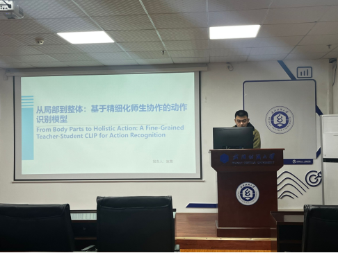 施霄同学分享的主题为“From Body Parts to Holistic Action: A Fine-Grained Teacher-Student CLIP for Action Recognition”。动态视频中的动作识别仍具挑战性,尤其在区分视觉相似的动作时。现有方法常依赖整体表征,却忽视了对准确分类至关重要的精细细节。他们提出一种新型精细化师徒CLIP(FT-CLIP)模型,通过师徒架构将肢体分析与整体动作识别相结合,弥合了精细动作解析与整体动作理解之间的鸿沟。教师模型通过处理个体肢体部件及专属描述生成部件特异性特征,随后将这些特征聚合并蒸馏至学生模型。借助可学习提示的知识蒸馏机制,学生模型在保持高效推理的同时,能有效学习捕捉动作间的细微差异。FT-CLIP通过从精细的身体部位分析逐步推进至整体动作识别,实现了对复杂动作的更细致理解。在Kinetics-TPS数据集的全监督环境实验,以及HMDB51和UCF101数据集的零样本环境实验均验证了本方法的有效性。