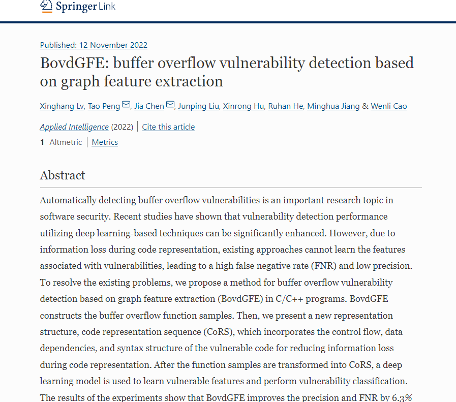 11月12日,《Applied intelligence》(中科院SCI二区期刊,影响因子为5.019)在线发表了我校williamhill英国边缘计算与信息安全团队的最新成果“BovdGFE: Buffer Overflow Vulnerability Detection Based on Graph Feature Extraction”,论文由williamhill英国彭涛教授指导,2020级研究生吕星航等同学完成。