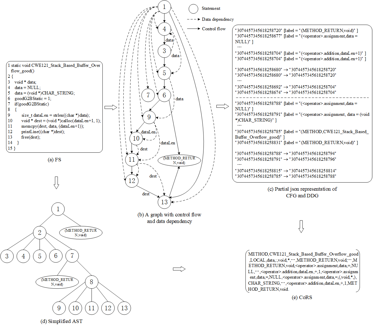 该论文研究报道了一种基于图特征提取的缓冲区溢出检测方法,用于C程序源代码的漏洞检测。提出了一种新的代码表征结构CoRS,与目前存在的表征结构相比,保留了更多与漏洞相关的语义和语法信息,以减少漏洞代码表征过程中的信息损失。考虑到代码的图结构(CFG,DDG等)无法做到漏洞样本类和良性样本类的完全分离,CoRS以图结构为基础,构建其JSON文本表示,以提取漏洞相关特征,得到漏洞代码序列。在NVD和SARD数据集上,相比于目前最先进的方法获得了较大的性能提升。