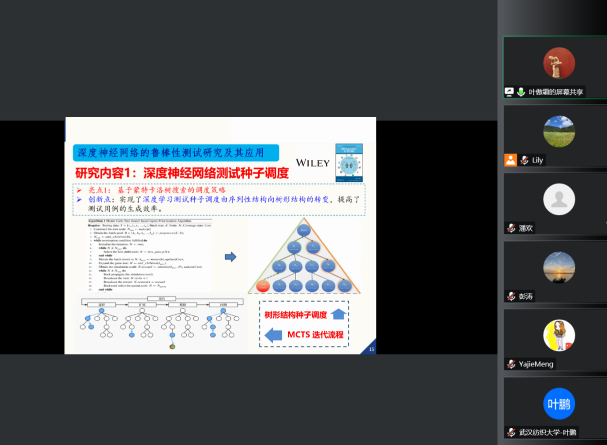 武汉大学叶傲霜博士在线为老师作题为“深度神经网络的鲁棒性测试研究及其应用”的学术报告。报告中讲到,当前深度神经网络的测试仍处于探索阶段,呈现出种子调度策略单一、模型架构失配等问题。他的研究主要以模糊测试为手段构建深度神经网络的安全保障体系并探其应用。主要从种子调度、测试度量元与基于深度学习的测试用例生成的角度,介绍了基于蒙特卡洛树搜索的种子调度策略、基于影响力的自适应度量元设计方法及基于Wasserstein生成对抗网络的测试用例生成方法等研究成果。