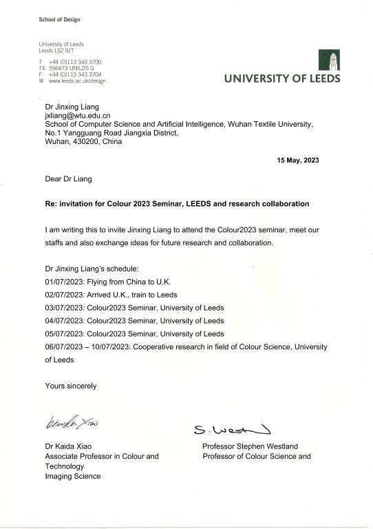 会议结束后,梁金星老师还分别拜访了利兹大学设计学院Kaida Xiao教授和Stephen Westland教授团队。与Kaida Xiao教授团队针对颜色科学研究进展进行交流,探讨了多光谱重建技术与肤色研究、手机传感器色彩增强研究的结合点,明确了2023年至2024年期间赴英国利兹大学为期一年时间的访问研究内容。与Stephen Westland教授团队针对成像科学和色彩设计进行交流,围绕纺织品颜色的照相测量关键技术及其在纺织服装色彩设计中的相关应用,探讨明确了访学期间与该团队在纹理织物颜色测量和评价方面可以合作的研究方向和内容。