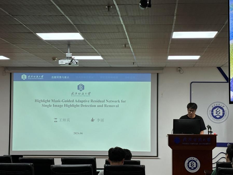 王帅宾同学分享的主题是“Highlight Mask-Guided Adaptive Residual Network for Single Image Highlight Detection and Removal”, 因为镜面高光检测和去除是一项具有挑战性的任务。尽管已有多种方法用于去除镜面高光,但由于高光通常具有高亮度和非均匀分布特性,这些方法通常无法有效地保留去除高光后物体的颜色和纹理细节。此外,在处理具有复杂高光属性的场景时,现有方法往往会遭遇性能瓶颈,限制了其应用范围。因此,他们提出了一种基于高光掩码引导的自适应残差网络(HMGARN)的方法。HMGARN由三个部分组成:Detection-Net,Adaptive-Removal Network和Reconstruct-Net。具体而言,Detection-Net能够从单个RGB图像中准确预测出高光掩码。随后,预测的高光掩码被输入到Adaptive-Removal-Net中,以自适应地引导模型去除镜面高光,估计出一个粗略的无镜面高光图像。最后,Reconstruct-Net被用来逐步细化这一粗略结果,去除残留的镜面高光,并构建最终的高质量无镜面高光图像。他们在公开数据集(SHIQ)上对该方法进行了评估,并通过对比实验结果验证了该方法的优越性。