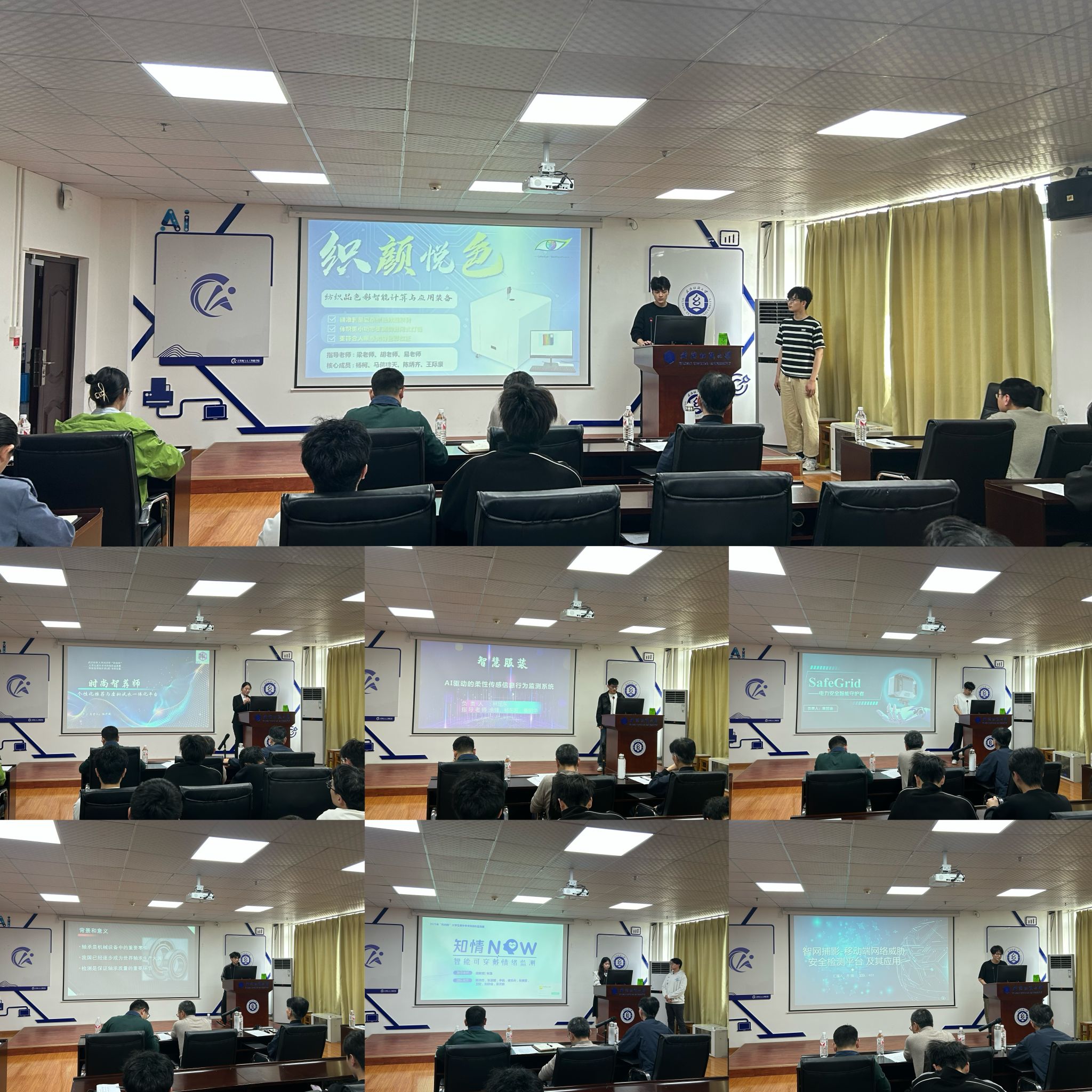 会上,七支参赛团队依次汇报项目进展,评审专家结合行业需求与竞赛标准逐一提出优化建议。“织颜悦色”项目聚焦光谱均匀照明技术,针对背景行业痛点提出创新方案,评审建议精简PPT内容,突出首创技术指标,明确第一发明人,并补充具体市场数据以增强说服力。“虚拟试衣”项目瞄准时尚产业数字化转型,评审指出需强化行业痛点分析,强调数据,同时明确专利发明人与论文作者的区别,细化与企业的合作细节。“电力安全智能守护者”项目使用基于深度学习的安全行为识别算法,动作识别算法等,使用系统可视化界面保障作业人员安全,评审建议优化PPT排版,以图表清晰展示技术迭代路径,加上动图和新闻证明安全隐患。“智网捕影”项目聚焦移动端网络安全检测领域,需补充核心技术拆解与竞品对比分析,以国家政策为切入点提升项目站位,将商业模式表述调整为商业价值。“轴承瑕疵检测系统”强调工业自动化检测,评审提议由学生出镜拍摄实操视频,直观展现技术应用场景。“知情Now”项目关注脑科学,帮助实时准确地了解自己的情绪状态,评审提议需减少文字描述,以流程图呈现解决方案,并增加实物演示环节以增强实践性。