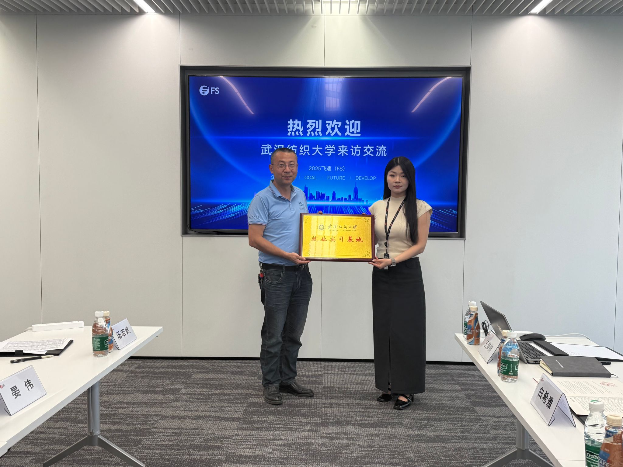 随后,在校企交流环节,晏伟、汤若釴、张栋同飞速创新技术股份有限公司人力资源经理白希雅、企业文化顾问李雪芳及校招团队成员就人才培养与产学研合作开展深入交流,并在该公司设立“就业实习基地”,完成授牌仪式。