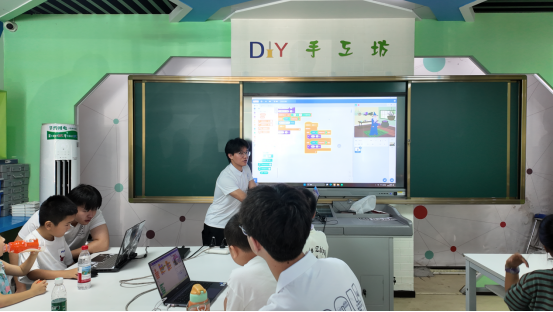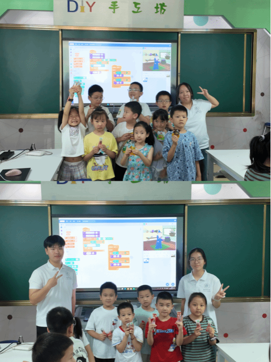为提升课堂趣味性与协作能力,实践团将全班划分为五个小组,引导学生组内互助、协作完成挑战任务。在互动与演示环节,孩子们积极展示自己的程序作品,展现出出色的表达力与逻辑思维。根据课堂表现、作品完成度、互动积极度等综合评分,第五组最终获得本次课程积分排名第一名。其中,王一州与郭云泽两位小朋友表现尤为突出,逻辑清晰、反应敏捷,并在课堂演示中带动小组团队不断优化程序细节,赢得在场老师与小朋友们的阵阵掌声。