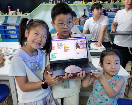 编程实操环节,孩子们纷纷化身“小程序员”,在电脑前认真调试模块代码,从角色造型到输入反馈、从变量设定到逻辑判断,每一步都亲手完成。课程设置循序渐进,既保障了基础认知,又增强了编程的成就感。教室里不时传来“我写对了!”“程序能动了!”的欢呼声,孩子们在欢笑中完成了他们人生中的“第一个算法项目”。
