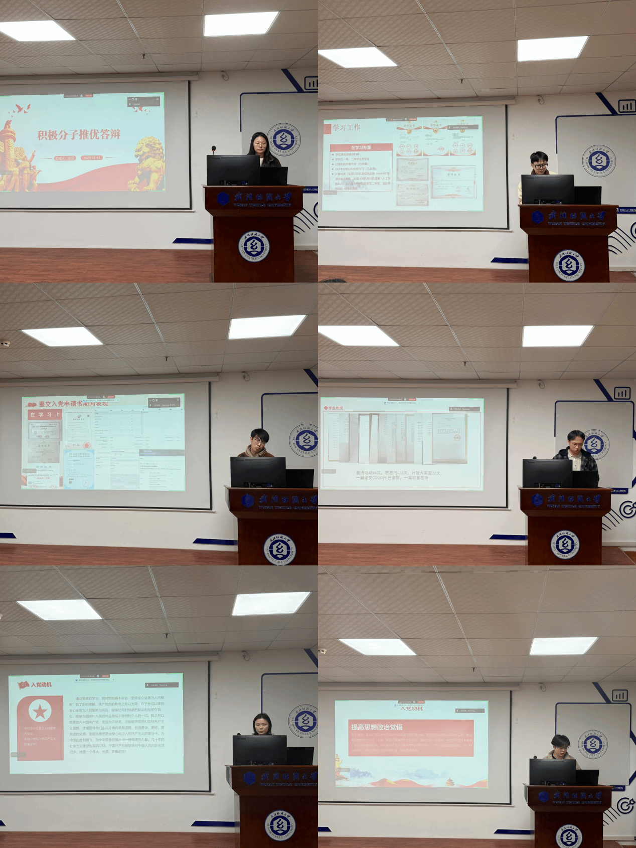 会议伊始,学院研究生党支部高翌涵详细介绍了本次推优答辩的流程规则、评审标准及注意事项,强调本次答辩旨在全面考察入党积极分子的思想觉悟、理论水平、学业科研及社会实践表现,为学院党员队伍建设筛选优秀后备力量。随后,每位入党积极分子依次上台,结合自身成长经历与实际工作,从对党的认识、入党动机、理论学习成果、参与志愿服务及科研项目的情况等方面进行汇报。