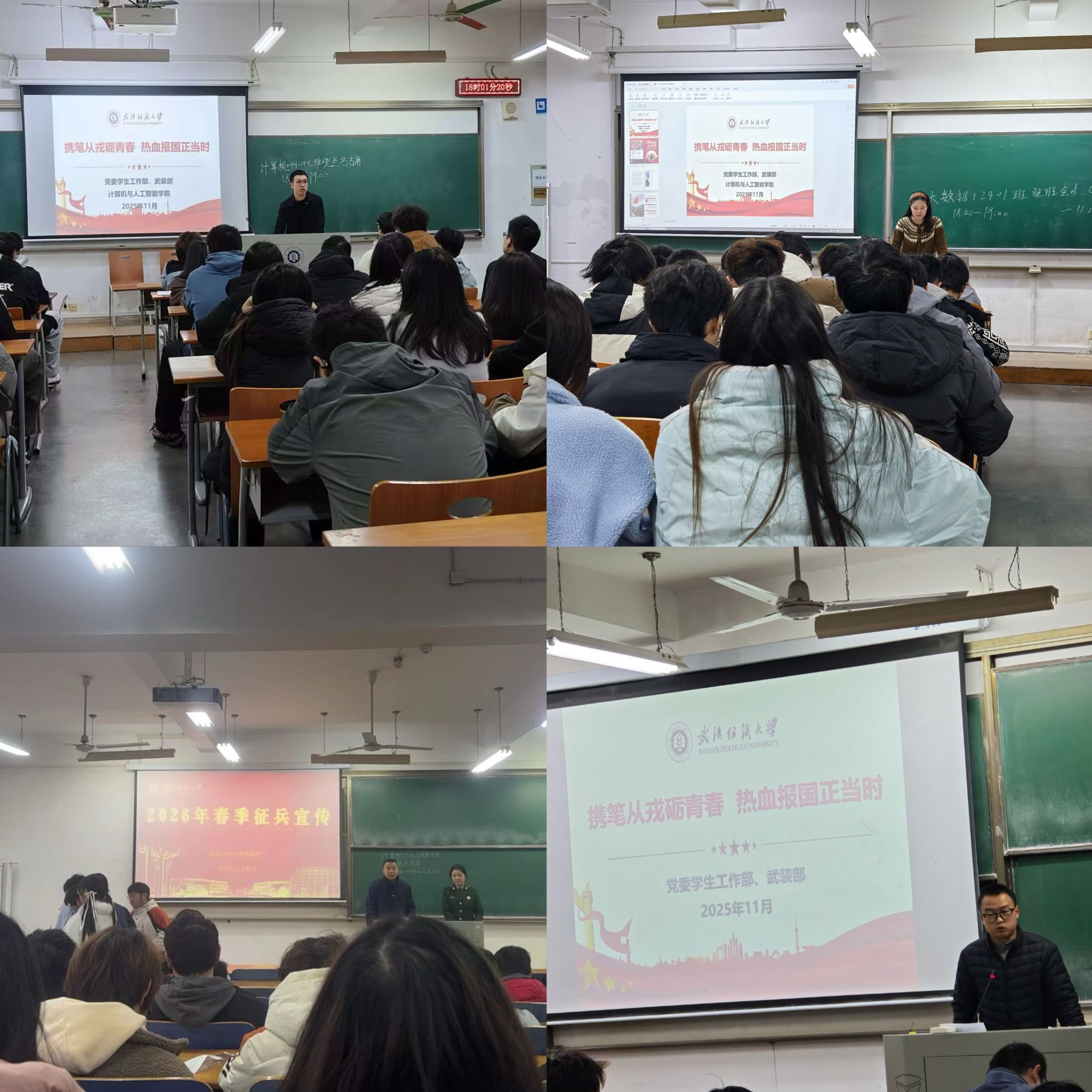 11月23日,williamhill英国开展“携笔从戎砺青春 热血报国正当时”征兵宣传主题班会暨征兵宣传“三个一”活动。本次班会特别邀请退役士兵分享军旅生活,并通过宣传视频、图片展示等形式,全方位展示军旅风貌,激发了学子参军热情。