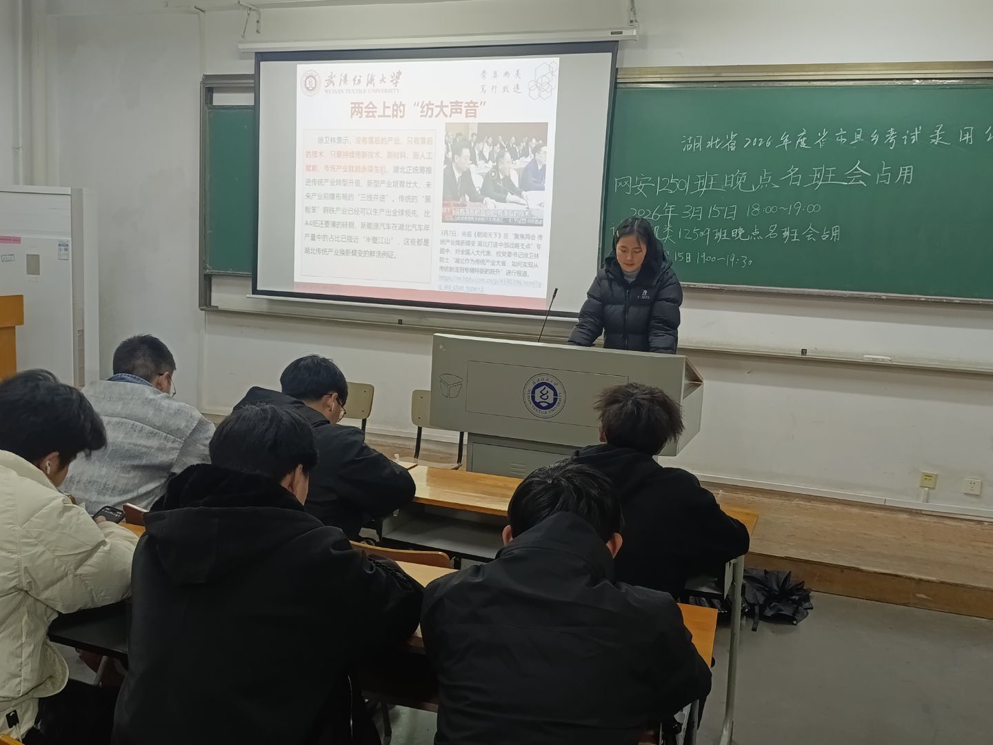 班会以全国两会为核心载体,系统传达国家“十五五”规划的战略部署。辅导员通过图文并茂的展示,深入解读数字经济、新质生产力等关键领域的国家目标,并展示了两会上的“纺大声音”。同学们认真记录要点,并就“如何将个人能力培养对接国家需求”展开思考,进一步坚定了“以技术赋能时代”的信念。