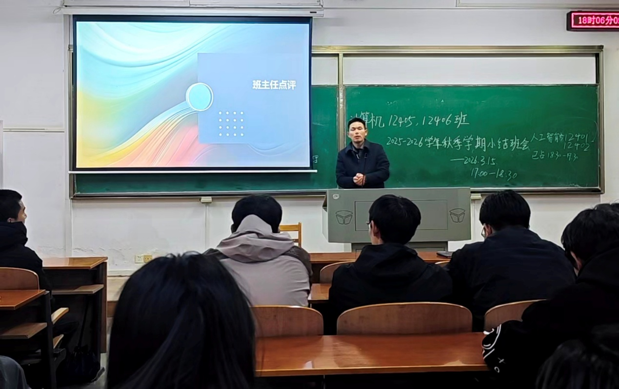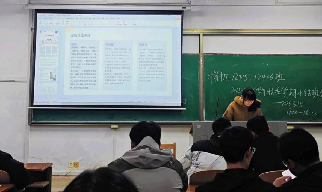为深入总结2025-2026学年第一学期学业情况,查找存在问题,明确努力方向,进一步巩固学风建设成果,计算机12406班于3月15日下午在崇志楼举行“大二上学期学业总结暨新学期规划班会”。班会由班长高智翔主持,班主任黄俊杰老师、辅导员李港老师及全体同学参加。班会寝室为单位的典型经验分享形式展开,旨在促进同学互学互鉴、补齐短板、凝聚共识,共同向“零挂科、高质量就业考研”目标迈进。
