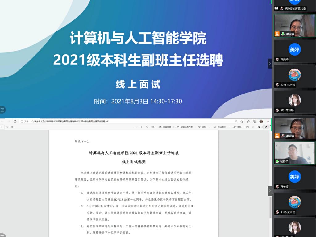 为了2021级本科生能够尽快熟悉校园环境、适应大学生活与学习,加强学院2021级本科生管理、教育工作,推进学院学生工作全面发展。8月3日下午,学院举行了williamhill英国2021级本科生副班主任选聘线上复试。本次复试由2021级本科生辅导员谢瑞清主持,并与2020级本科生辅导员喻仪、院学生会主席团成员杨静贤共同担任评委,经过前期自主报名和资格审查,共37位同学参与复试。