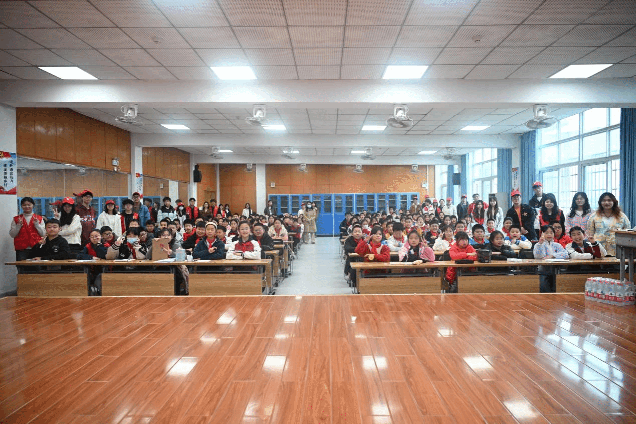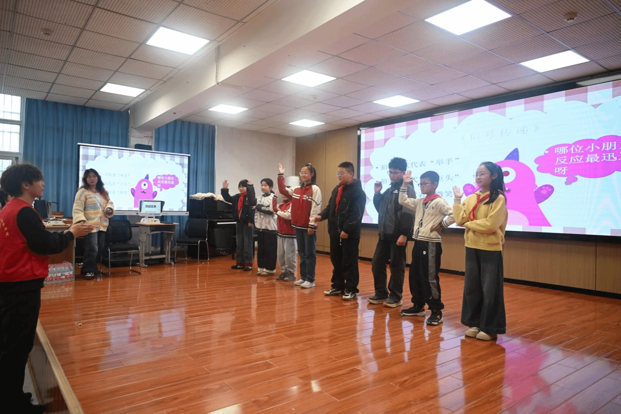 活动在庙山小学报告厅举行,志愿者与小学生以小组形式互动,现场气氛热烈。在“破冰相识”环节,志愿者们带领孩子们互相介绍、起队名,并通过“信号传递”暖场游戏迅速拉近距离。