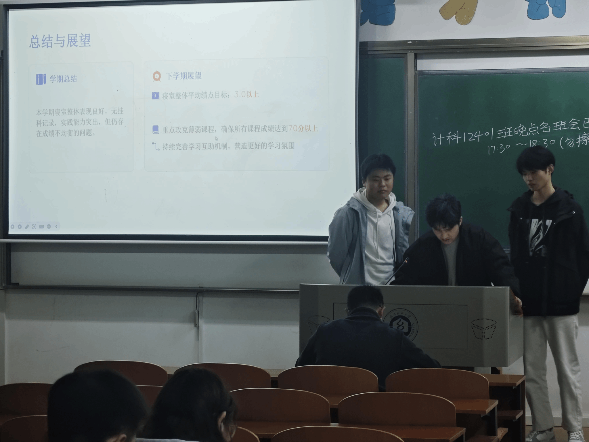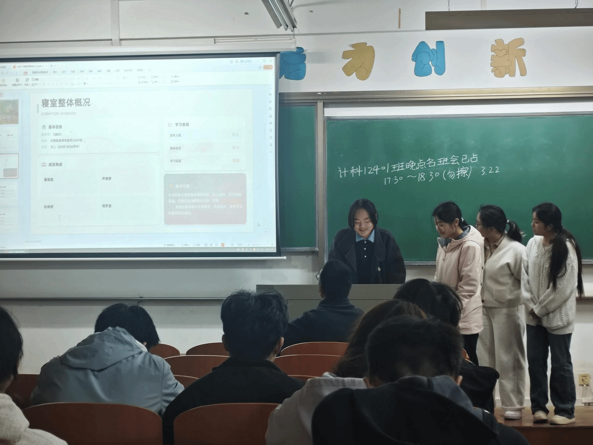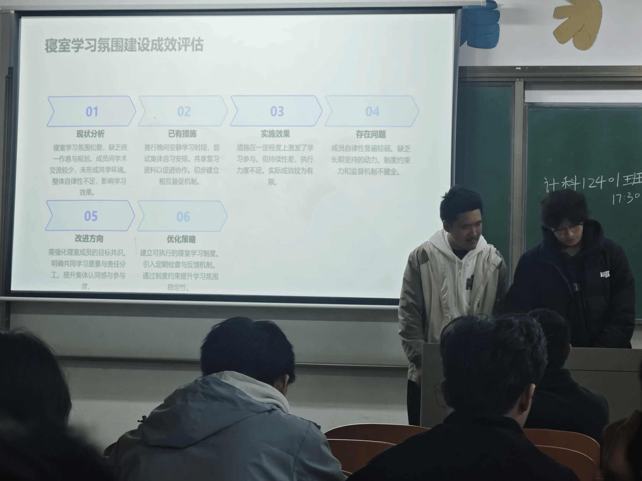 4B507寝室代表汇报了全寝学期表现,客观分析了寝室学习氛围松散、缺乏统一规划、成员学术交流少等问题,介绍了已推行的晚间安静学习、集体自习、资料共享等改进措施,并明确了后续强化目标共识、建立学习制度、制定统一作息、建设学习角等优化策略。