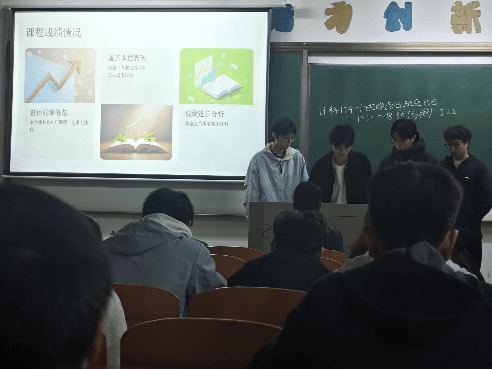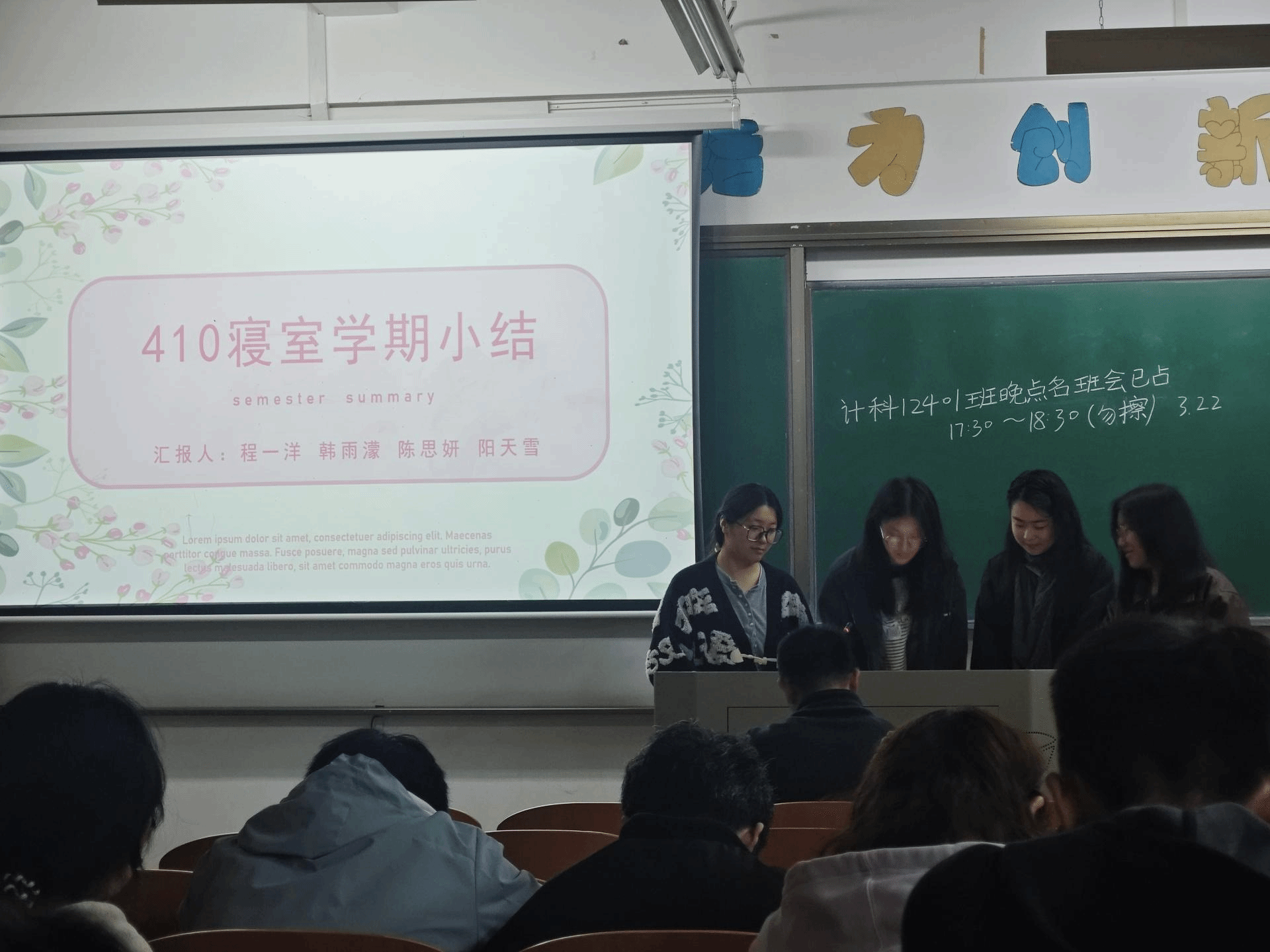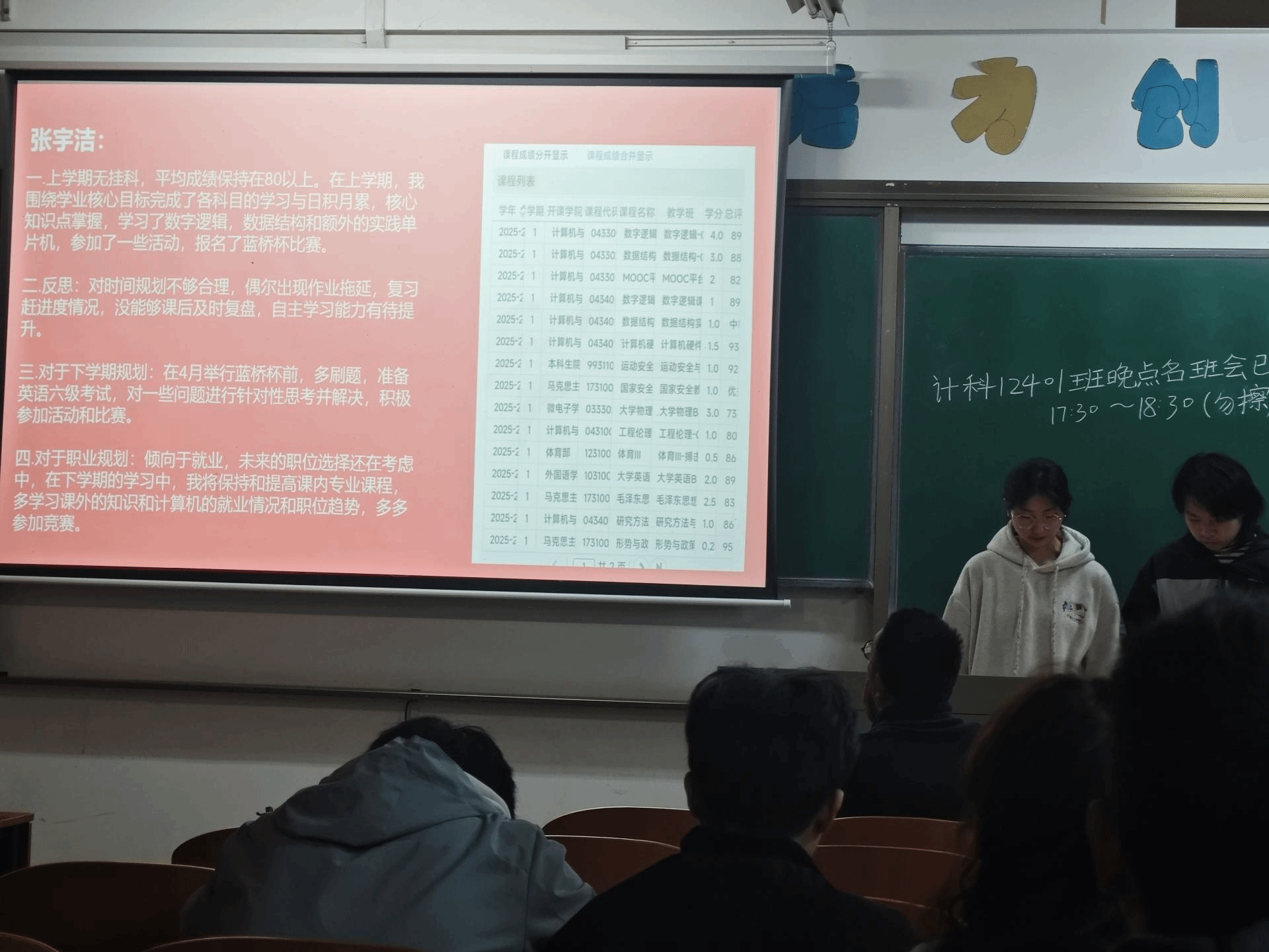 4B507寝室代表汇报了全寝学期表现,客观分析了寝室学习氛围松散、缺乏统一规划、成员学术交流少等问题,介绍了已推行的晚间安静学习、集体自习、资料共享等改进措施,并明确了后续强化目标共识、建立学习制度、制定统一作息、建设学习角等优化策略。