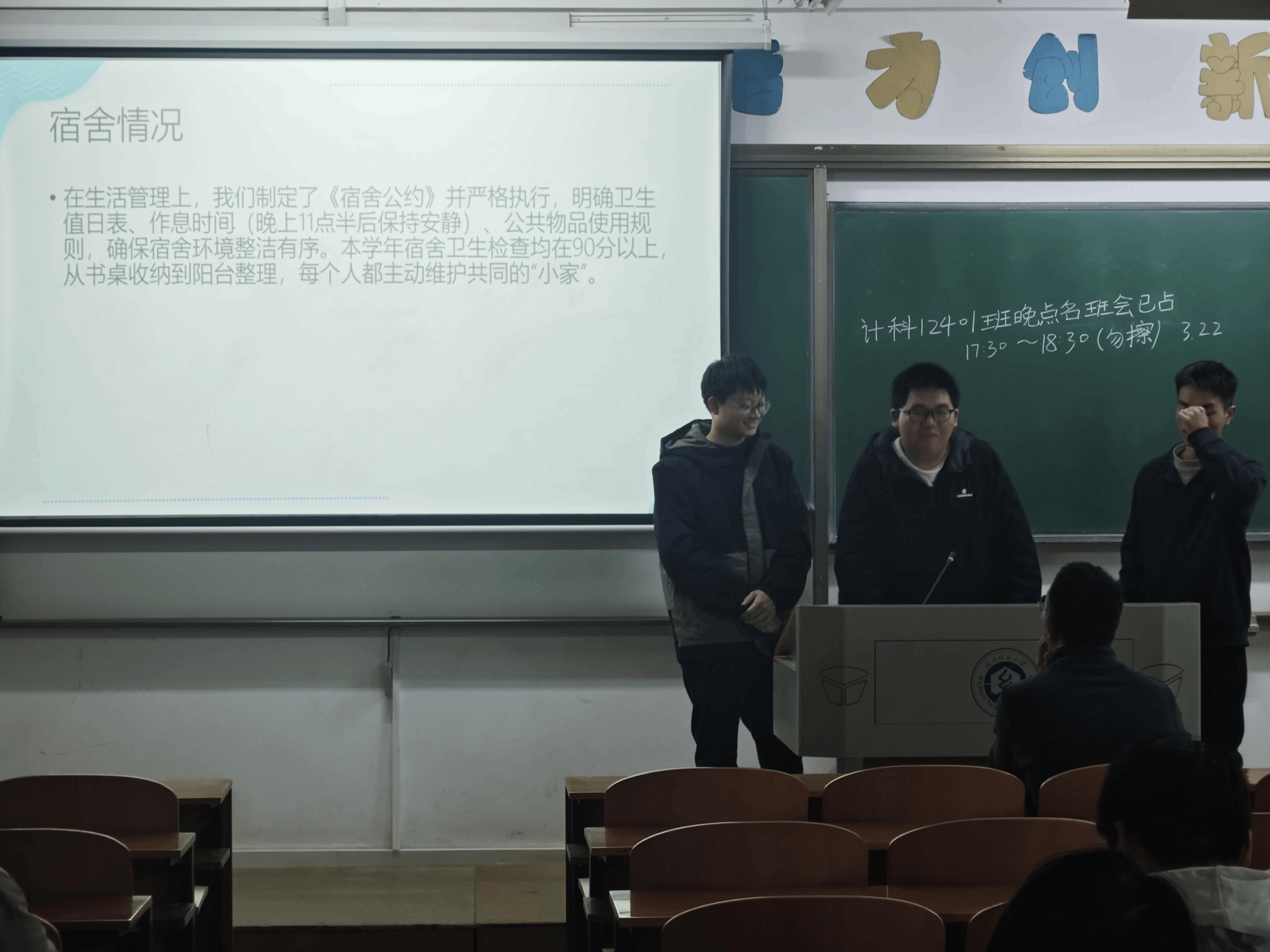 按照抽签排序,各寝室依次展开汇报,其中男生寝室率先登场、有序分享。汇报过程中,各男生寝室代表紧扣学期学习核心,聚焦专业知识掌握、课堂出勤表现、作业完成质量等关键方面,既坦诚梳理了自身及寝室在学习中存在的不足,也分享了彼此互助学习、共同进步的实用经验,同时结合专业学习特点,明确了后续查漏补缺、深耕专业的具体计划。