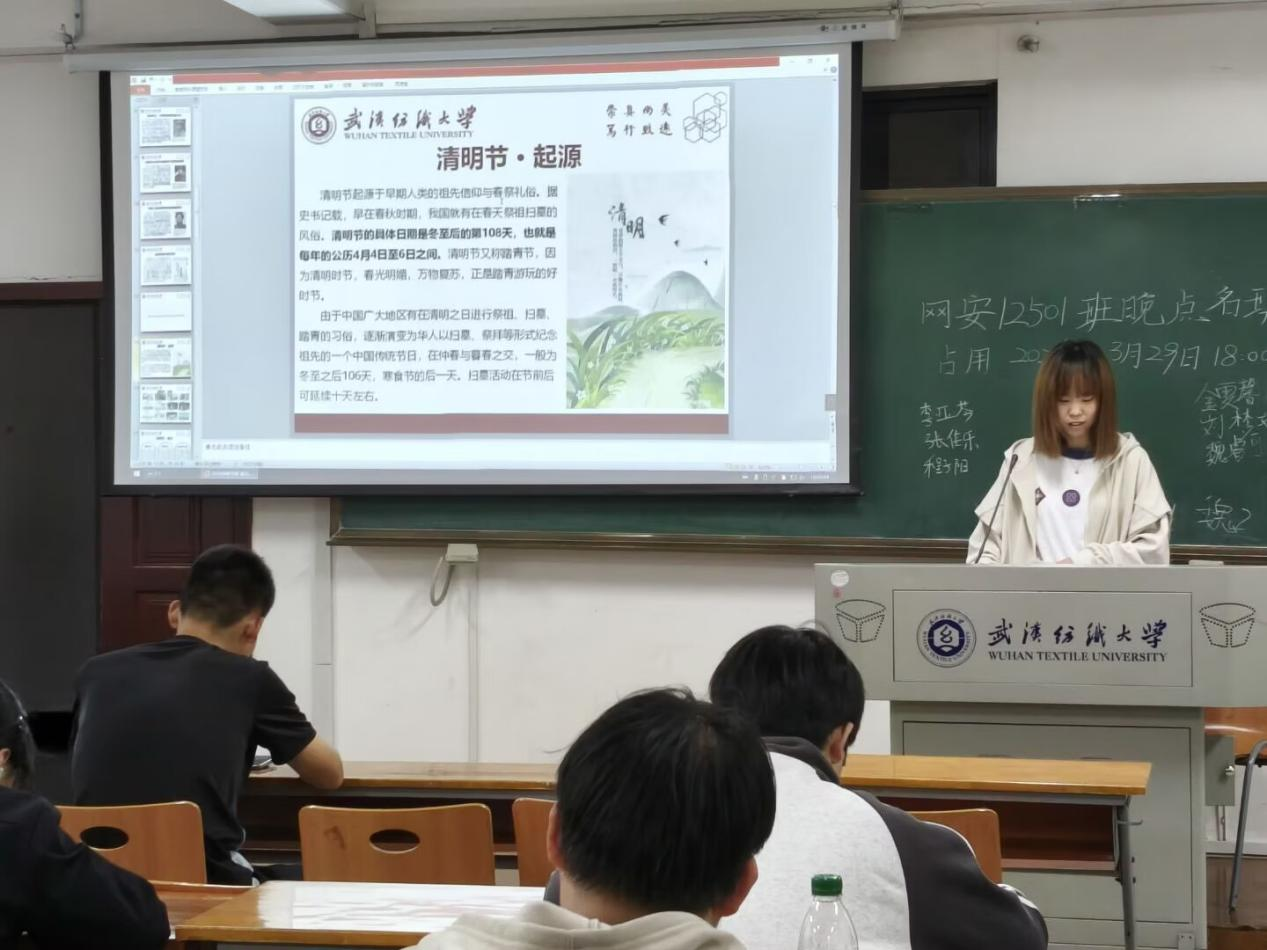 班会第二环节,围绕清明节传统文化展开学习。同学们通过PPT了解清明节源于上古时期的祖先信仰与春祭礼俗,知晓其兼具自然与人文两大内涵,既是节气也是节日。大家共同学习扫墓、踏青、插柳等传统习俗,感受中华优秀传统文化的深厚底蕴,在缅怀先辈的同时,进一步增强文化自信与民族自豪感。