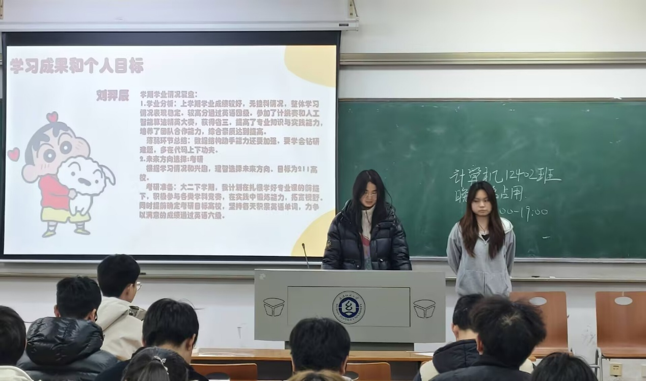 会议伊始,班长卻昌辉率先对班级整体学业情况进行全面复盘。他以平均绩点、挂科率、优秀学子表彰等关键数据为脉络,细致剖析班级学业现状,既明晰了优势学科的亮眼表现,也精准梳理出薄弱环节。通过直观的数据分析,帮助同学们找准提升方向,确保新学期发力有据、追赶有标。