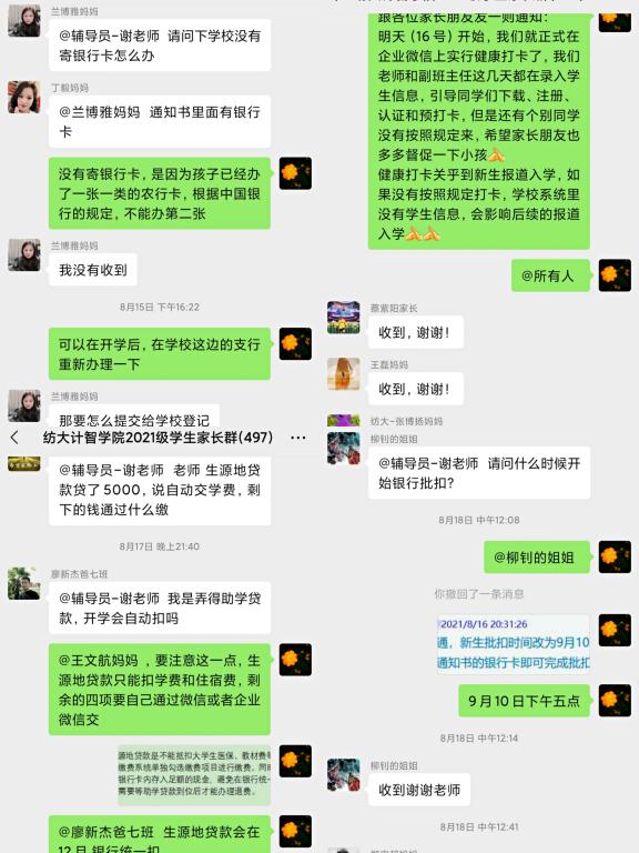 为加强学校与家长间的联系,引导家长科学教育子女、形成家校教育合力。在建立2021级新生群的同时,同步建立了2021级新生家长群,并通过新生各班副班主任向新生家长们及时传达入群消息,以最快速度建立不缺一人的学生群、家长群,保证重要信息在学生与家长间的全覆盖。同时也及时在家长群中解答家长们的问题,并为有需要的家长提供及时的帮助。