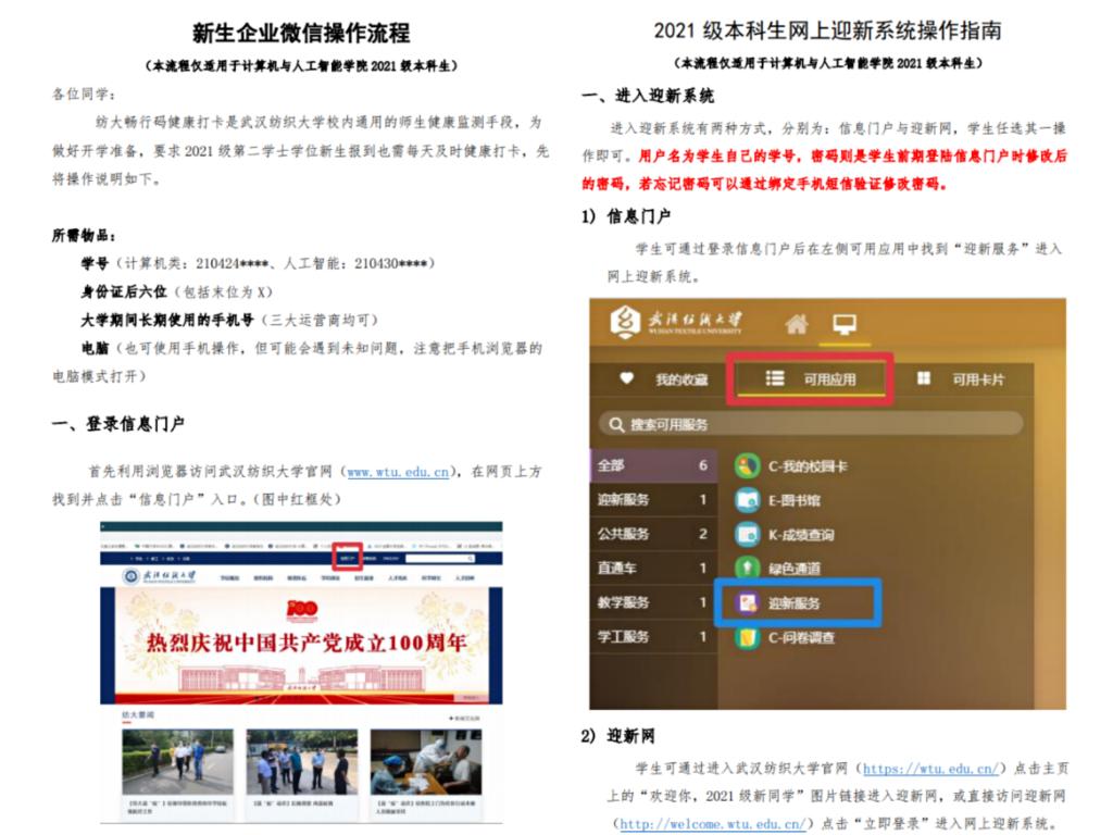 院学生会针对后续新生绑定企业微信、网上迎新系统报道等任务,结合了学院具体情况,以学校官方操作手册为基础,更为细致化地编写了《计智学院新生企业微信操作流程》、《计智学院2021级本科生网上迎新系统操作指南》等手册。