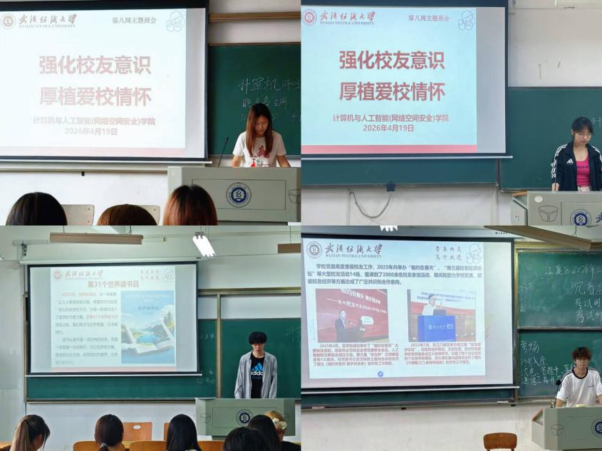 为加深同学们对校友文化的了解,丰富班级课余生活,培养大家的阅读习惯,计算机与人工智能(网络空间安全)学院于4月19日召开了“强化校友意识,厚植爱校情怀”主题班会。此次班会向大家分享了优秀校友的故事,以及校友为母校发展做出的点滴贡献,让同学们对校友文化有了更清晰的认识。