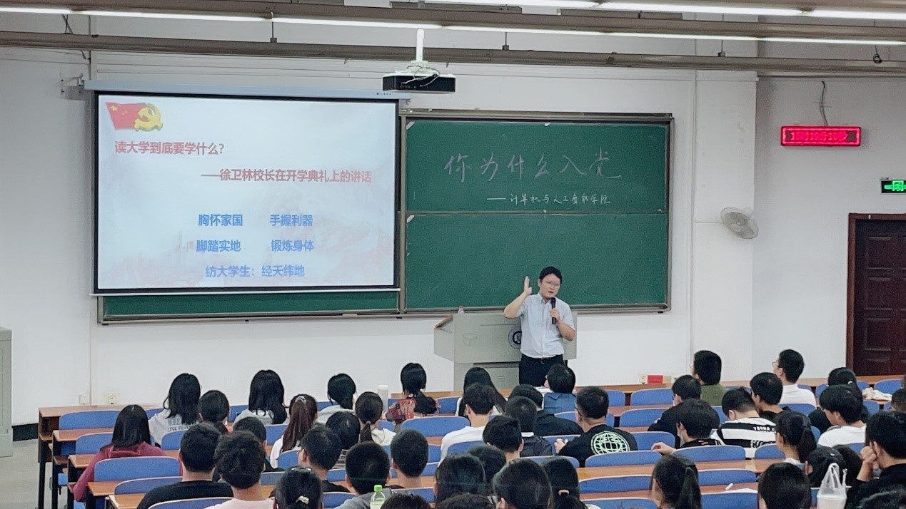 涂书记以“为什么选择计算机专业”为切入点,将我们的学习与国家发展、民族振兴联系起来,点拨大家确立学习的目标,并提出入党的重要性。他指出,当代社会大学生党员比例并不高,但社会尤其重视学生党员。提起我们党的历史,涂书记的谆谆教诲令人难忘:“党员不是为了应付,也不是为了谋取利益,而是吃水不忘挖井人的爱国情怀。祖国需要我们,我们要不忘初心,积极投身到祖国的建设中,党员前辈有抛弃一切报效家国的决心,我们大学生也必须有这样的觉悟。”