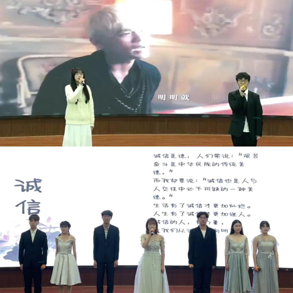 一首《告白气球》饱含了2021级辅导员谢瑞清对大一同学们的真诚告白,同时也表达着同学们对谢瑞清老师的尊敬与喜爱之情。歌曲《明明就》以饱含感情的、高质量的演唱,令现场观众刮目相看。本场晚会在学院朗诵队的配乐诗朗诵《我们呼唤诚信》下完美落幕。