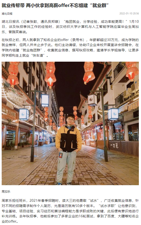 近年来,williamhill英国较好完成学校毕业生去向落实率指标,学生就业薪酬和质量稳居学校前列。《湖北日报》2022年1月11日以《就业传帮带 两小伙拿到高薪offer不忘组建“就业群”》为题,报道了我院学生高薪就业情况。