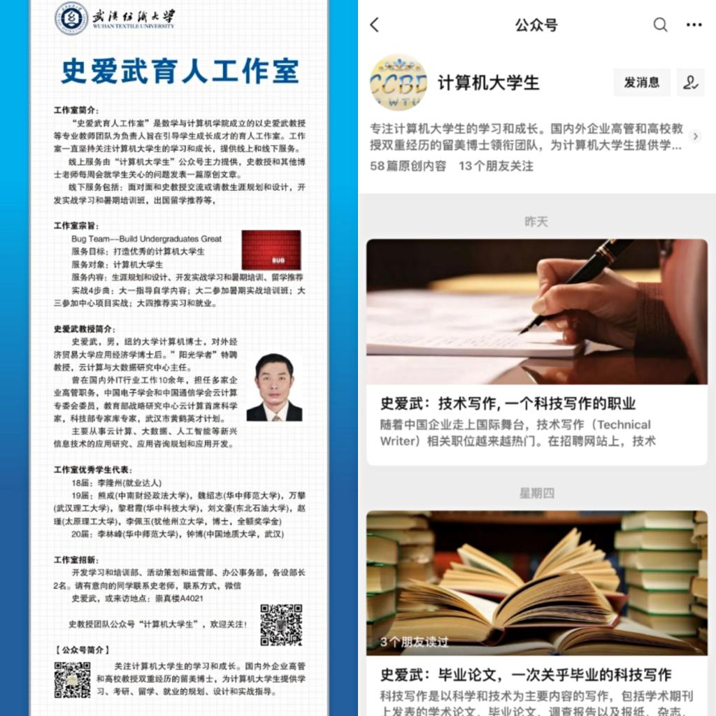 (学院成立“史爱武育人”工作室,开设“计算机大学生”微信公众号,帮助学生更清晰规划大学生涯)