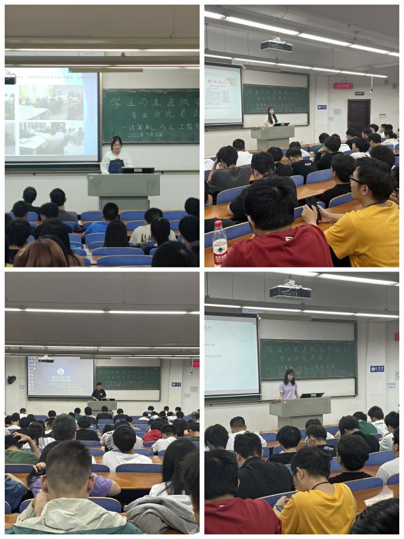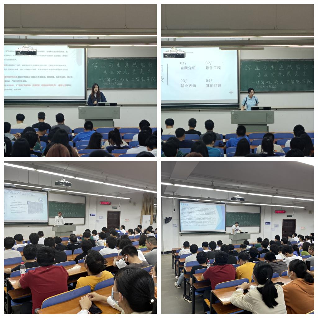 为帮助21级学生合理规划大学学习,了解各个分流专业方向,更好地选择适合自己的专业,计算机学院于5月22日晚18:30-19:30、19:30-20:30分场次在T102教室开展朋辈间的专业分流恳谈会。本次恳谈会共邀请了9位大二的优秀同学结合自身经历,就自己所在专业的特点、开设课程、学习方法以及如何选择专业等方面的内容,为学弟学妹们答疑解惑,21级辅导员谢瑞清及全体21级学生参与此次恳谈会。