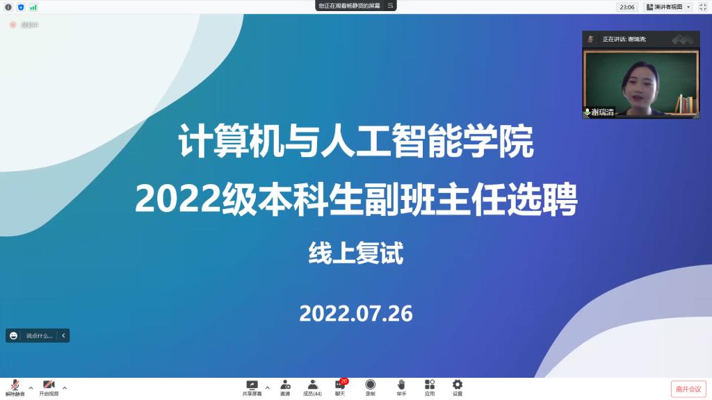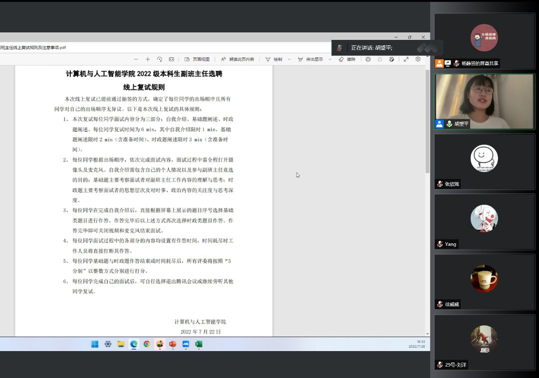 为了协助学院更好地开展2022级新生的教育管理工作,引领新生更快更好地适应大学生活,7月26日晚,2022级副班主任复试以线上的方式有条不紊地展开。2022级本科生辅导员廖龙、2021级辅导员谢瑞清、院学生会主席团成员梁鸣岩以及2021级副班主任杨静贤共同担任评委,线上复试由院学生会主席团成员胡望平主持。