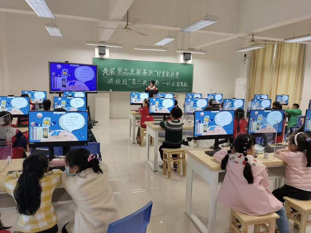 对于一至二年级的小朋友,服务队的教学更侧重于基础知识的了解与应用,课前在复习上节课的内容时,小朋友们都能够快速且准确地答出知识要点。播放生动有趣的小短片时,小朋友们聚精会神地聆听着计算机的发展史,了解那些他们从未听说过的知识,为心田里的计算机种子撒下露珠。对于稍微深奥一点的内容,志愿者哥哥姐姐们都会及时关注并给小朋友解疑答惑。