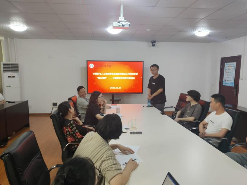 会上,大数据专业毕业生代表依次发言,介绍目前状况、有什么困难困惑、对学院工作建议等。胡新荣逐一听取学生的汇报,并就他们当前的情况进行了解答与建议,胡新荣勉励同学们在最后时刻一定要沉着冷静,为自己的前景多加考量,在就业上既要有“进一步”的空间,更要有“退一步”的余地;学业上及时请教老师,争取顺利完成毕业答辩。