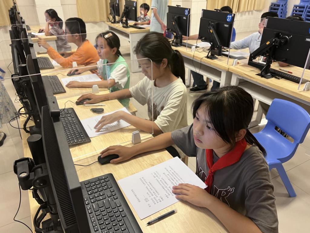 这是个风和日丽的下午,高年级的孩子们迎来了他们的最后一节课。志愿者在孩子们心中种下的“计算机科普”小苗相继开花结果,也到了验收成果的时候了。志愿者老师早已调试好考试设备,拿出精心准备的考核试题,等待着孩子们的到来。