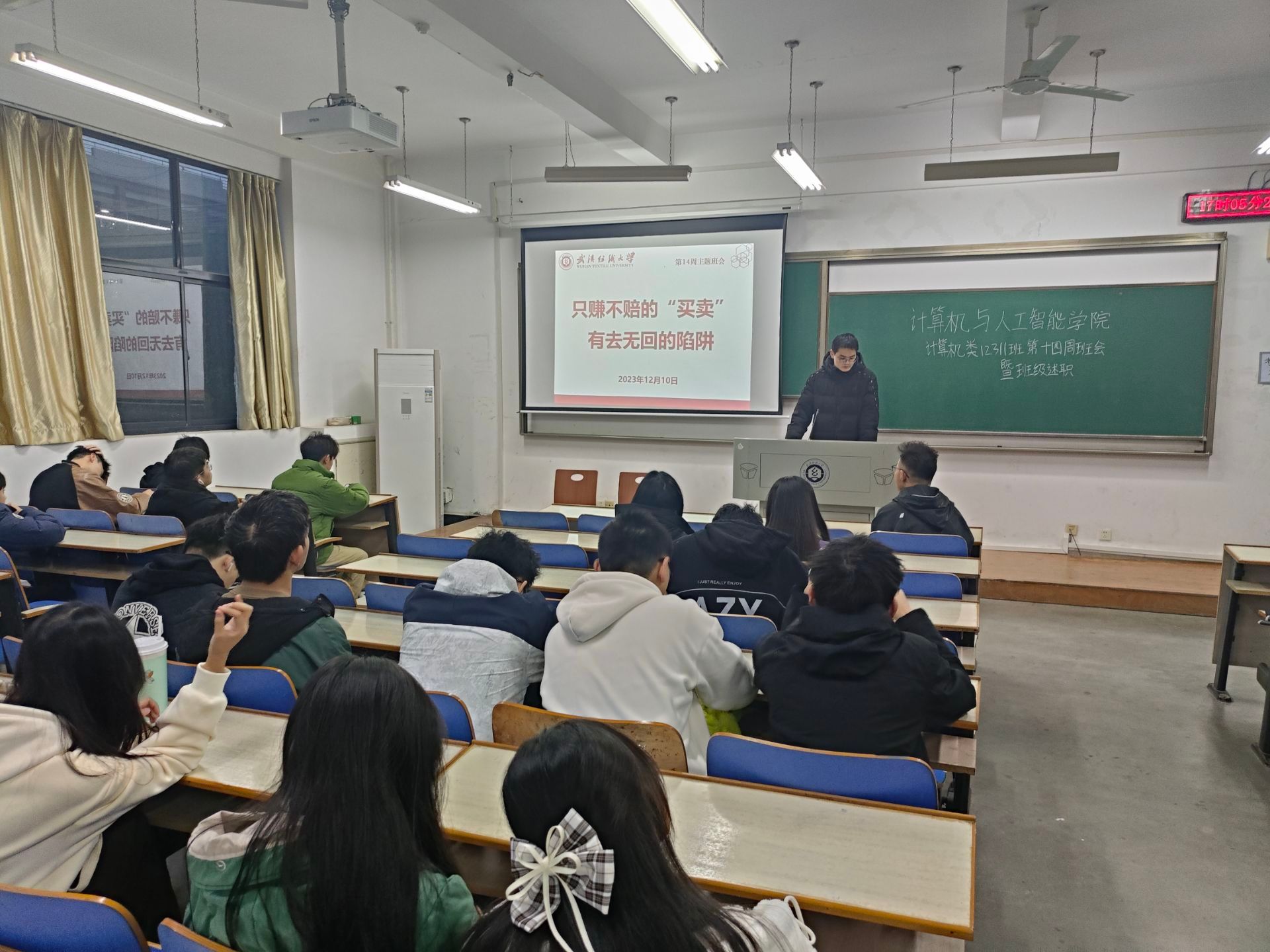 最后,辅导员再次为同学们介绍了近期电信诈骗的案例,强调不要向陌生个人账号汇款转账,向平台注资时要多方验证是否合法正规。一旦遭遇诈骗,保存好汇款或转账时的凭证并立即报警。
