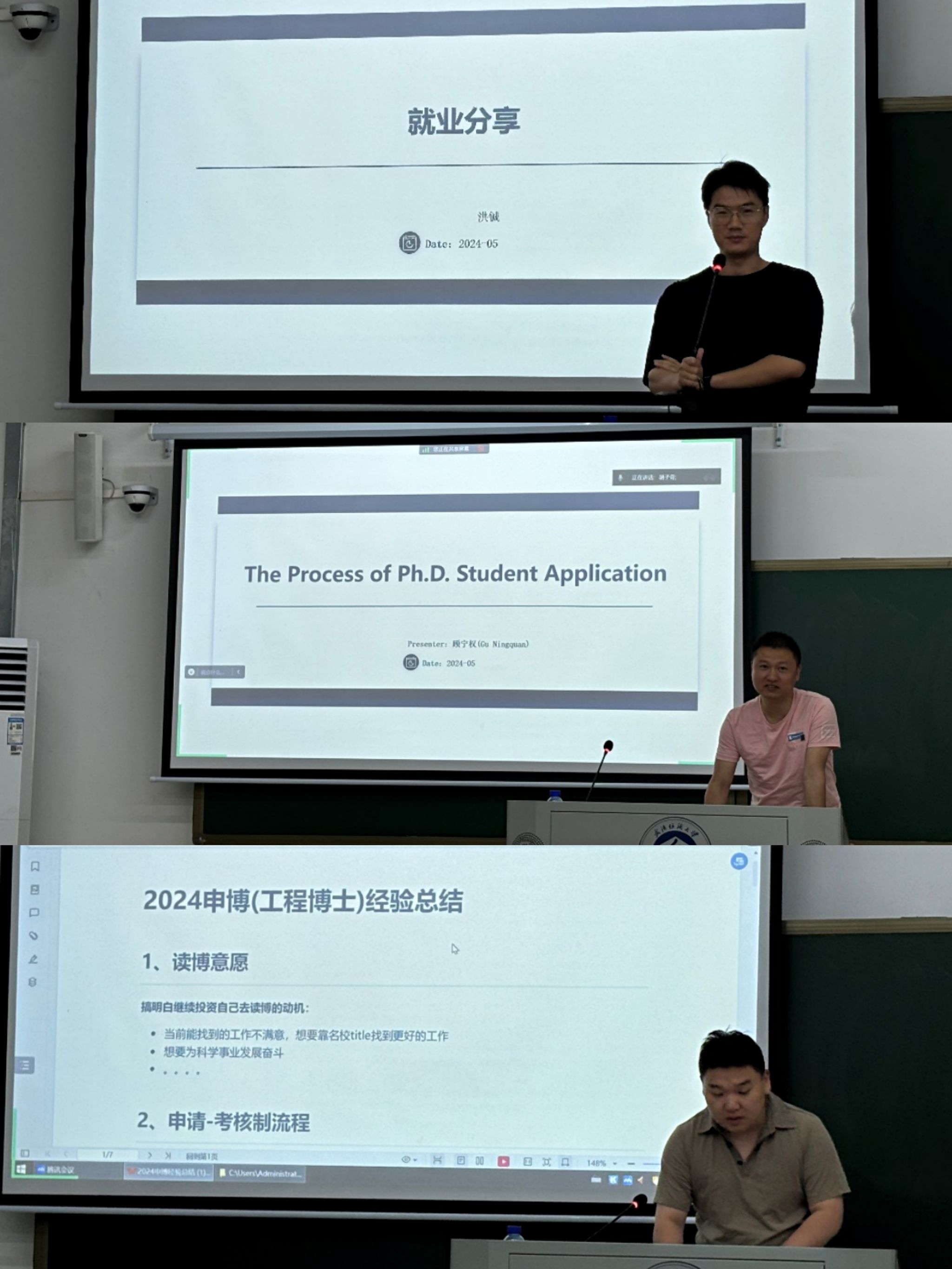 顾宁权以其丰富的国外博士申请经验为大家解惑,分享了申请技巧和注意事项,为想要以后迈入国际学术殿堂的学生指点迷津。原少将则从国内博士申请的角度出发,分享了他在国内求学的心得和体会,为想要在国内读博的学生提供了宝贵经验,也介绍了申请博士的流程。胡畅和樊旺伟带来了考公经验的分享。他们结合自身经验,逐步剖析了考公的重要性以及应对考试的方法。他们谈到了备考的艰辛,但更强调了坚持的重要性。洪铖和王子琪则从企业就业的角度出发,分享了就业经历和感悟,以及如何在求职过程中找到自己的定位和方向,为以后想要踏入企业的同学提供了一份实用指南。