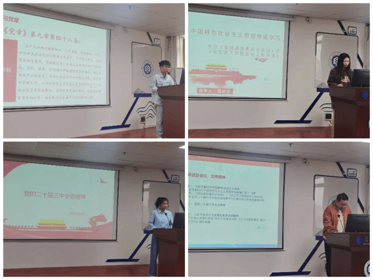 会议伊始,全体起立奏唱国歌并重温入党誓词,随后程彬洁同志带领大家学习习近平新时代中国特色社会主义思想,黄旻璇同志领学党的二十届三中全会精神,杨学周同志带领大家学习习近平总书记考察湖北的重要讲话精神。