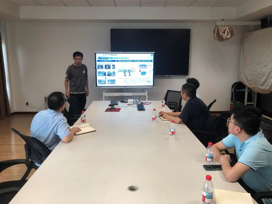 参观完工厂纺织机械运作后,青年博士吴杰详细介绍了自己的研究方向与特色成果,并在智能化改造和条桶搬运机器人研发等方面初步达成共识。