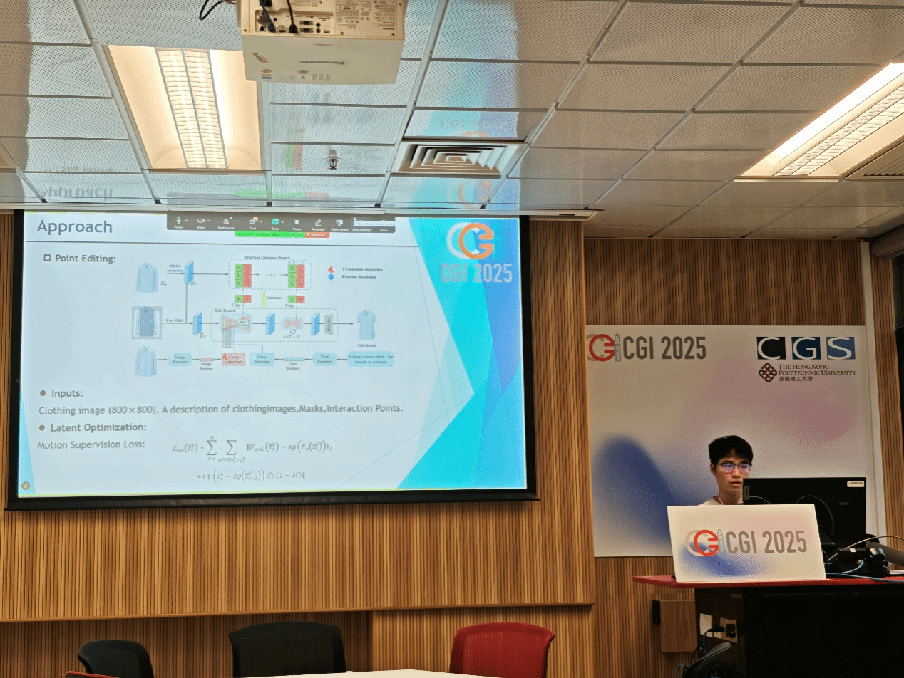 williamhill英国的研究生张文豪和郑思成受邀参会,并于7月16日和17日分别在分会场和主会场进行了论文宣讲。郑思成同学的论文《MIGEdit: Multimodal Interactive Garment Editing》聚焦于多模态交互服装编辑技术,提出了一种创新的编辑方法,旨在提升虚拟服装设计的交互性和实用性。
