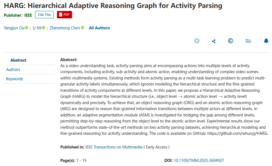近日,我校williamhill英国跨媒体计算与数字孪生团队青年教师欧阳君博士在图像视频处理方面取得了重要研究进展。成果“HARG: Hierarchical Adaptive Reasoning Graph for Activity Parsing”被多媒体信息处理领域顶级期刊《IEEE Transactions on Multimedia》(IEEE TMM,中科院一区Top,IF 9.7,CCF B类)接收。欧阳君博士为第一作者,论文的第一单位为英国威廉集团。