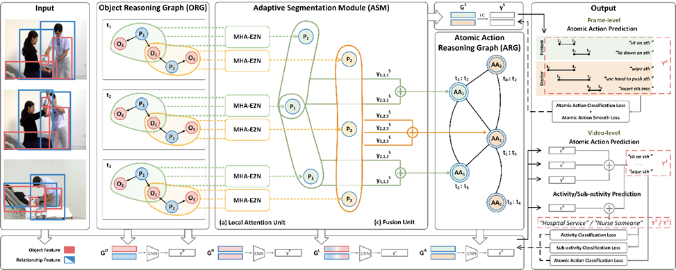 视频行为识别是视频理解领域的核心研究方向,在公共安全监控、视频内容审核等现实场景中具有广泛的应用前景。然而,真实世界中的活动往往是复杂的,通常涉及多个行为者、多个目标以及它们之间随时间变化的复杂交互关系。为了解决这些难点,本研究提出了一种分层自适应推理图(HARG)方法,用于动态且精确地建模视频活动解析中的层次结构,即“目标层→原子动作层→行为层”。该方法通过设计目标推理图和原子动作推理图,实现了不同层级之间、多个行为主体之间的细粒度信息传递与推理。此外,研究还引入了自适应分割模块,用于弥合不同层级之间的语义鸿沟,支持从目标层级到原子动作层级的逐步推理。