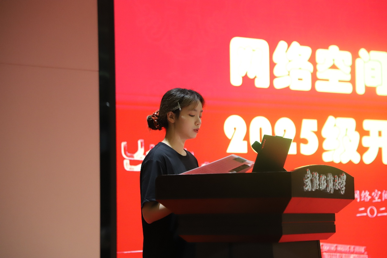 2025级网络空间安全专业新生代表赵诗慧妍同学上台发言。她分享了自己在入学前的假期里,便主动提前了解专业知识、开展先导学习的经历,表达了对即将开启的大学生活的憧憬与刻苦求学的决心,展现了首届网安新生的积极风貌与求知热情。